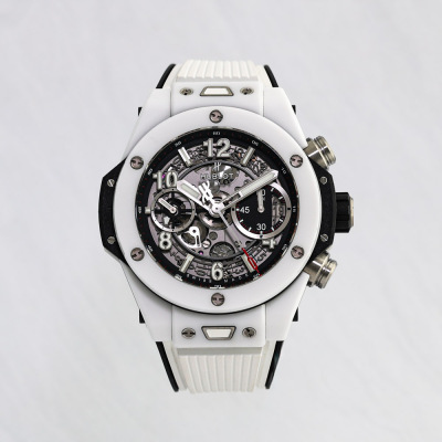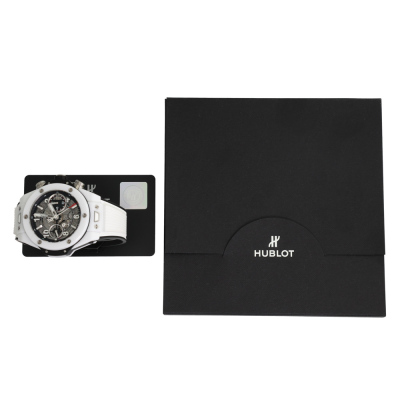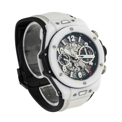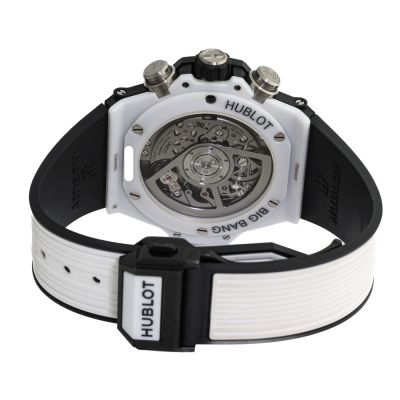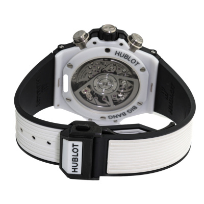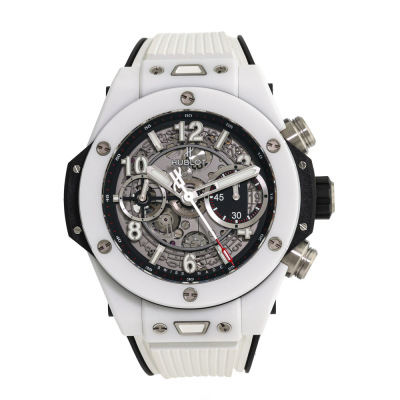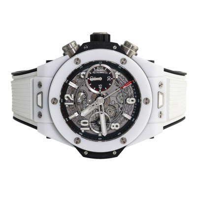 Hublot Big bang Unico ceramic and titanium automatic mens watch. Skeleton chronograph dial, date, case diameter: 44mm, adjustable max wrist size: 20cm, Swiss made. Ref# 441.HX.1170.RX. With Hublot white rubber strap and clasp. With Certificate of Authenticity, Hublot International Warranty card dated 14/10/2019 and Hublot box. 3 month FSA warranty