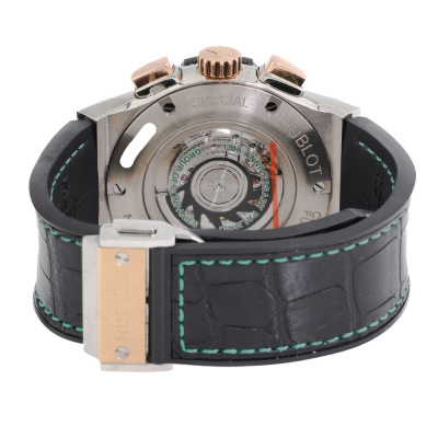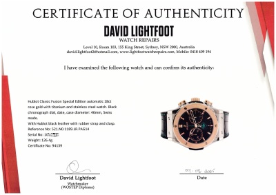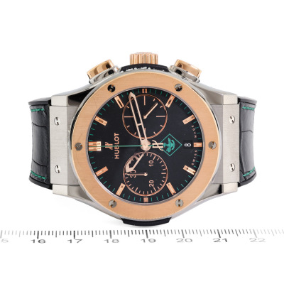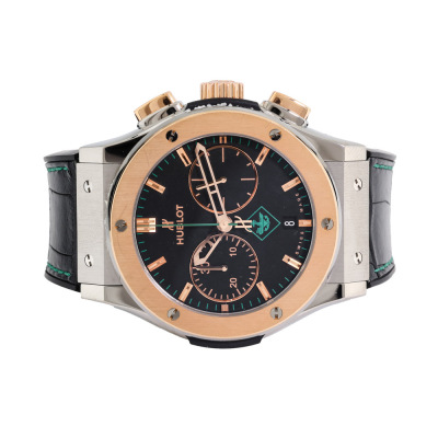 Hublot Classic Fusion Special Edition automatic 18ct rose gold with titanium and stainless steel mens watch. Black chronograph dial, date, case diameter: 46mm, adjustable max wrist size: 20cm, Swiss made. Ref# 521.N0.1189.LR.PAG14. With Hublot black leather with rubber strap and clasp. With Certificate of Authentcity and Hublot box. 3 month FSA warranty (Pre-owned)