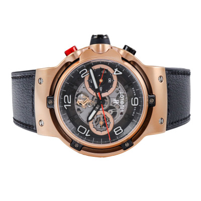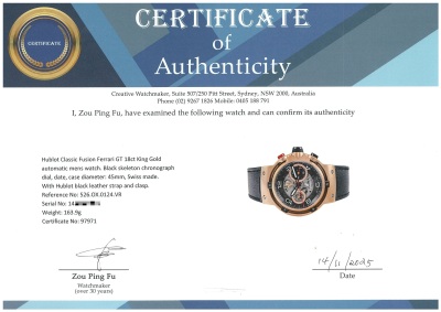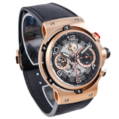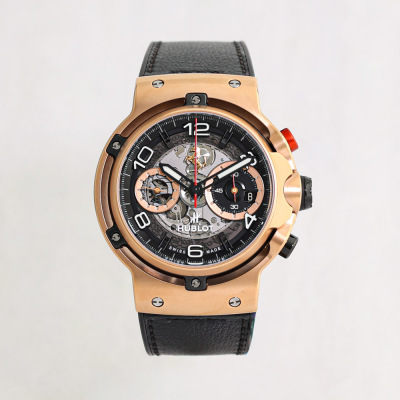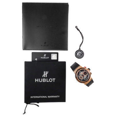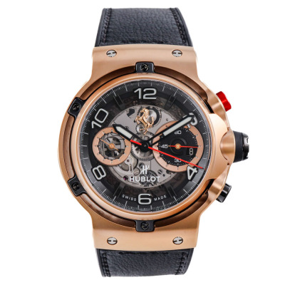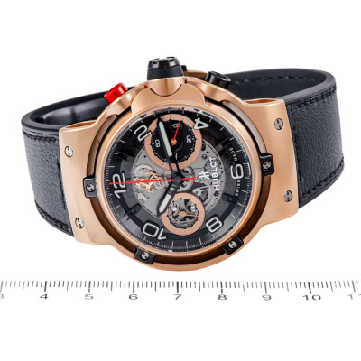 Hublot Classic Fusion Ferrari GT 18ct King Gold automatic mens watch. Black skeleton chronograph dial, date, case diameter: 45mm, wrist size: 20cm, Swiss made. Ref# 526.OX.0124.VR. With Hublot black leather strap and clasp. With Certificate of Authenticity, Hublot paper dated 09/10/2019 and Hublot box. 3 month FSA warranty. Weight: 163.9g (Pre-owned)
