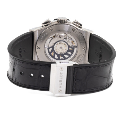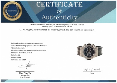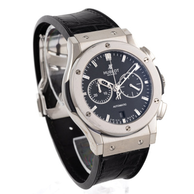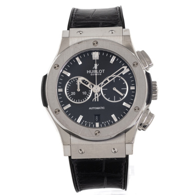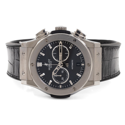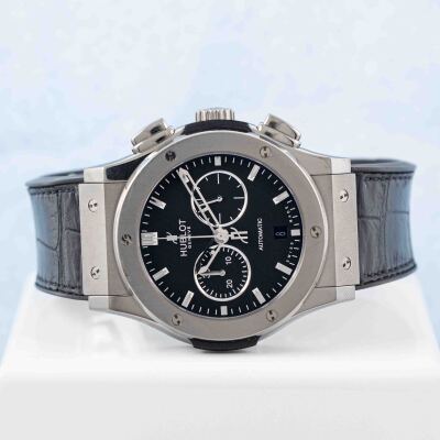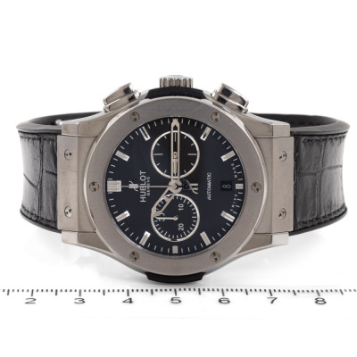 Hublot Classic Fusion titanium automatic mens watch. Black chronograph dial, date, case diameter: 42mm, adjustable max wrist size: 19.5cm, Swiss made. Ref #541.NX.1170.LR. With Hublot black leather x rubber strap and clasp. With Certificate of Authenticity. 3 month FSA warranty. (Pre-owned)