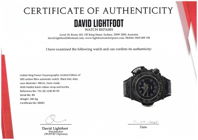 Hublot King Power Oceanographic Limited Edition of 500 carbon fibre automatic mens watch. Black dial, date, case diameter: 48mm, bracelet length: 22.5cm, Swiss made. Ref# 731.QX.1140.RX RX. With Hublot black rubber strap and buckle. With Certificate of Authenticity, Hublot spare white rubber strap and screw with a box. 3 month FSA warranty (Pre-owned)