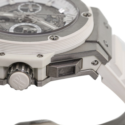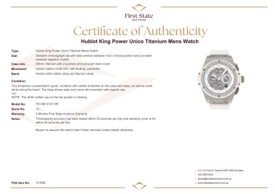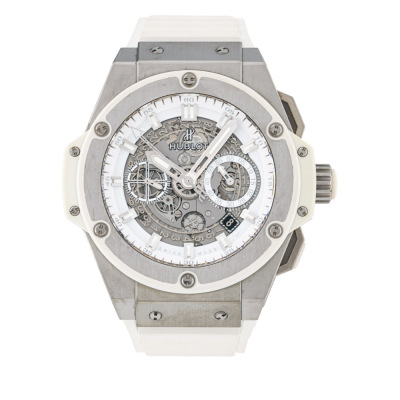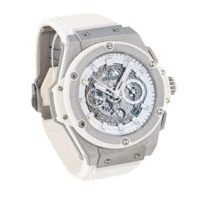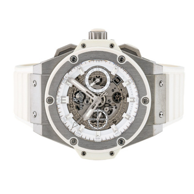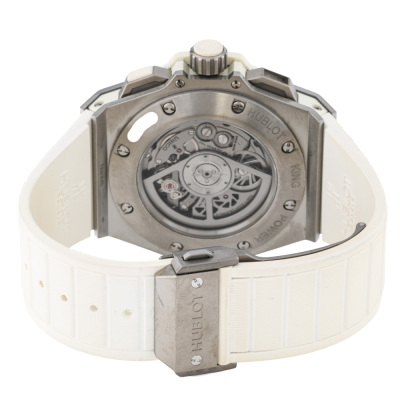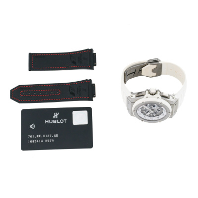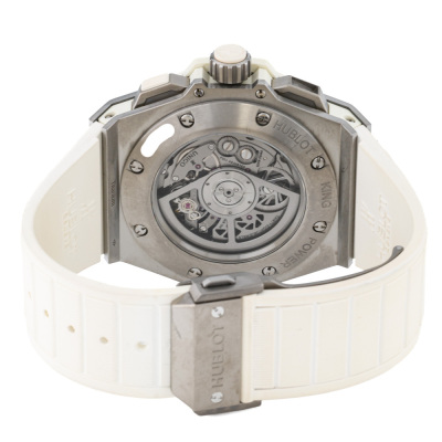 Hublot King Power Unico titanium automatic mens watch. Skeleton chronograph dial, date, case diameter: 48mm, wrist size: 19.5cm, Swiss made. Ref# 701.NE.0127.GR. With Hublot white rubber strap and clasp. With Certificate of Authenticity, Hublot International Warranty card dated 09/03/2017, spare Hublot light grey textile/ rubber strap and Hublot box. 3 month FSA warranty
