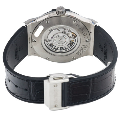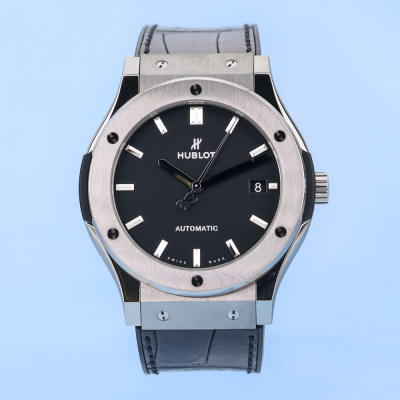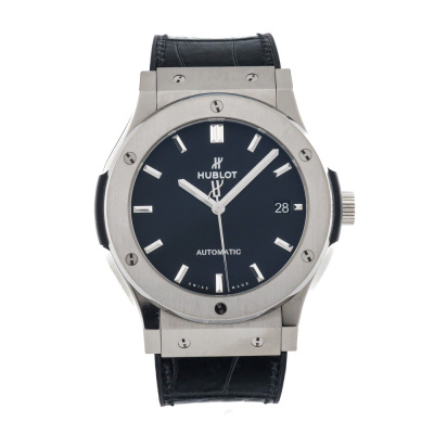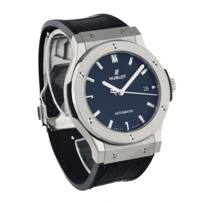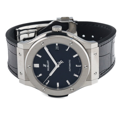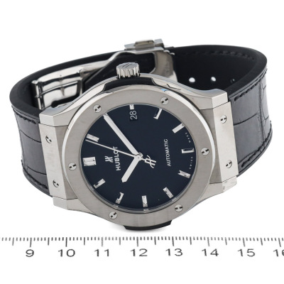 Hublot Classic Fushion stainless steel automatic mens watch. Black dial, date, case diameter: 45mm, adjustable max wrist size: 20.5cm, Swiss made. Ref# 511.NX.1171.RX. With Hublot black leather/rubber strap and clasp. With Certificate of Authenticity. 3 month FSA warranty (Pre-owned)