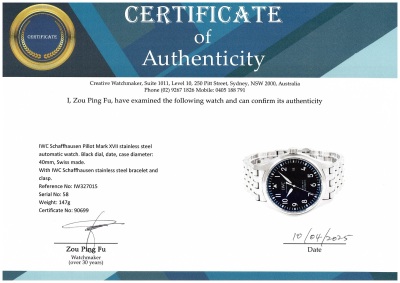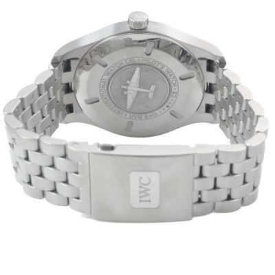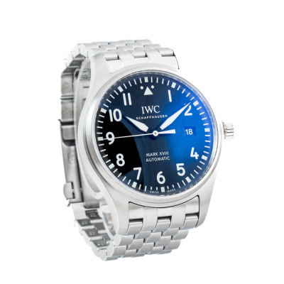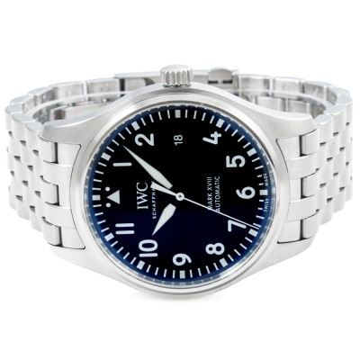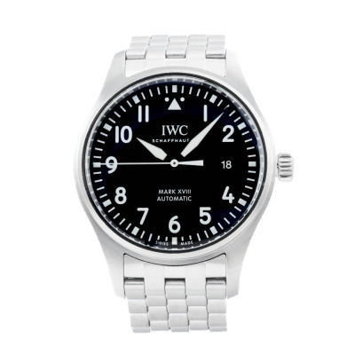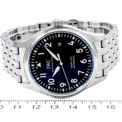 IWC Schaffhausen Pillot Mark XVIII stainless steel automatic mens watch. Black dial, date, case diameter: 40mm, bracelet length: 18cm, Swiss made. Ref# IW327015. With IWC Schaffhausen stainless steel bracelet and clasp. With Certificate of Authenticity and spare unbranded strap. 3 month FSA warranty (Pre-owned)