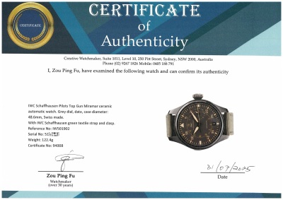 IWC Schaffhausen Pilots Top Gun Miramar ceramic automatic mens watch. Grey dial, date, case diameter: 48.6mm, maximum wrist size: 20cm, Swiss made. Ref# IW501902. With IWC Schaffhausen green textile strap and clasp. With Certificate of Authenticity. 3 month FSA warranty. (Pre-owned)