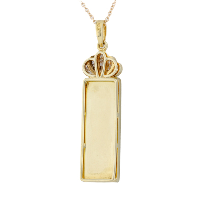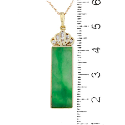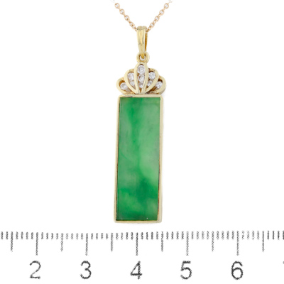 Jade and Diamond pendant with rectangular shape Natural Geen Jadeite Jade Type A of size 24.8 x 9.3mm and round Natural Diamonds totalling approximately 0.08ct. 14ct yellow gold with 40cm 14ct yellow gold chain. Weight: 5.5g. (Pre-owned)