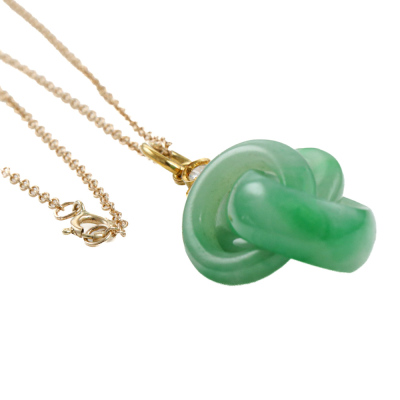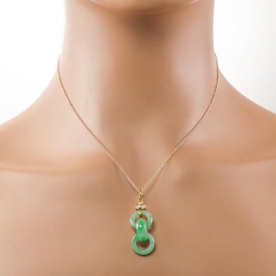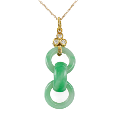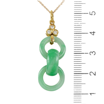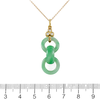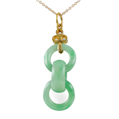 Jade and Diamond pendant with 3 interlocking rings Natural Green Jadeite Jade - Type A of diameter: 12.8mm and round Natural Diamonds totalling approximately 0.12ct. 14ct yellow gold with 40cm 14ct yellow gold chain. Weight: 4.1g. (Pre-owned)