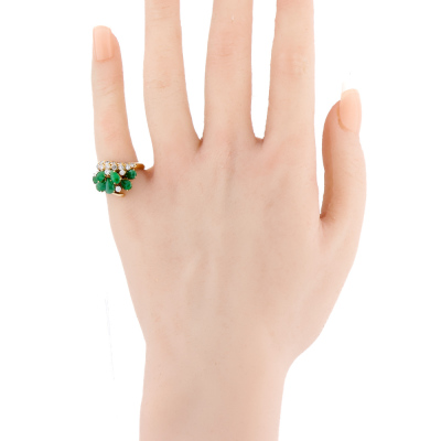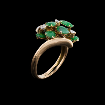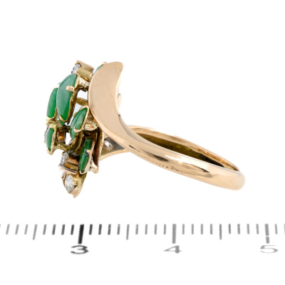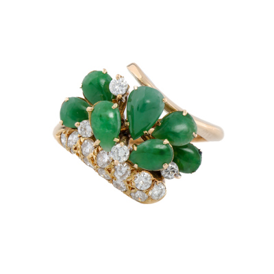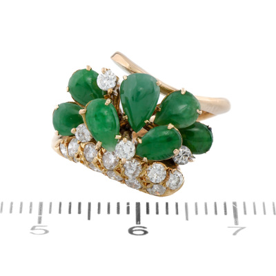 Jade and Diamond ring with 7 pear shape cabochon cut Natural Green Jadeite Jade - Type A totalling approximately 1.00ct and round Natural Diamonds totalling 0.50ct (Estimated grading: H-I SI). 18ct yellow gold. Ring size: J1/4. Band width: 2.3mm - 2mm. Weight: 4.5g. (Pre-owned)