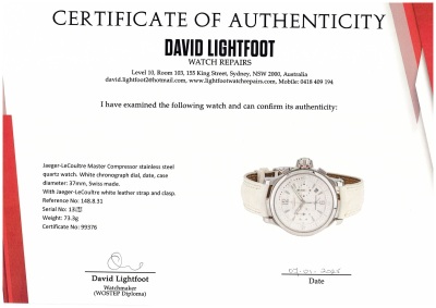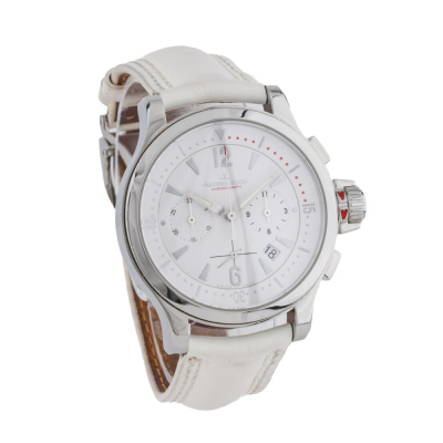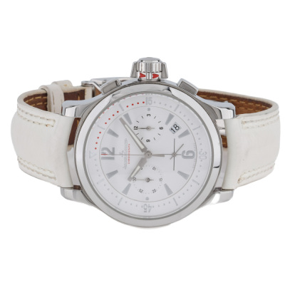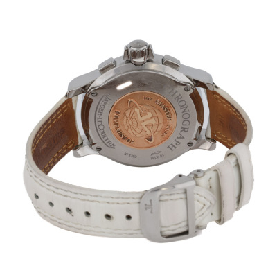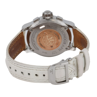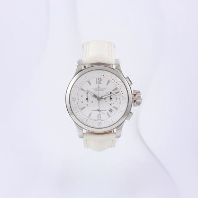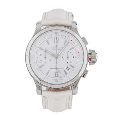 Jaeger-LeCoultre Master Compressor stainless steel quartz mens watch. White chronograph dial, date, case diameter: 37mm, wrist size: 17cm, Swiss made. Ref# 148.8.31. With Jaeger-LeCoultre white leather strap and clasp. With Certificate of Authenticity. 3 month FSA warranty. Weight: 73.3g (Pre-owned)