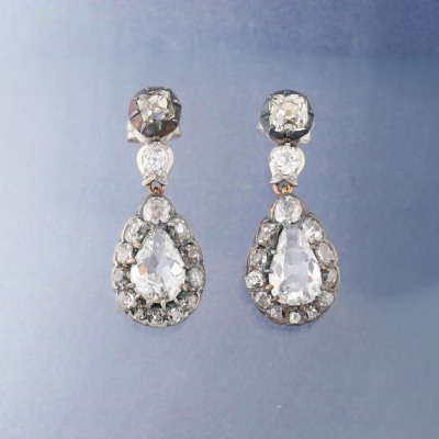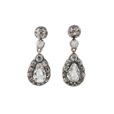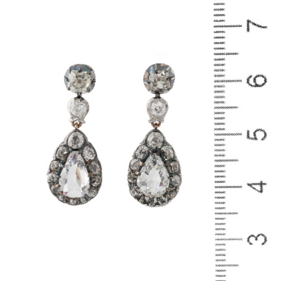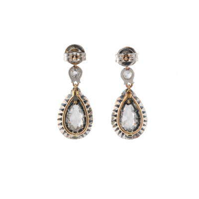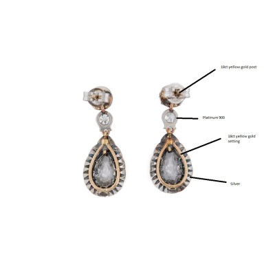 Kozminsky antique Georgian Diamond drop earrings with 2 pear shape Natural Diamonds totalling approximately 1.20ct (Estimated grading: H-I SI-P1) and 28 old mine cut Natural Diamonds totalling approximately 2.00ct (Estimated grading: I-J & K-M SI-P2). Set in Silver, 18ct yellow gold and Platinum 750 with one platinum 900 back and one 18ct white gold back. Drop length: 2.6cm. Weight: 4.7g. With Kozminsky box. (Pre-owned)