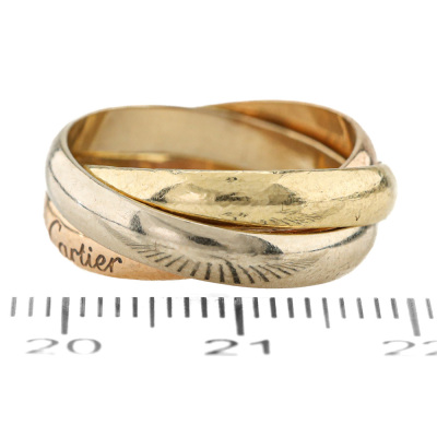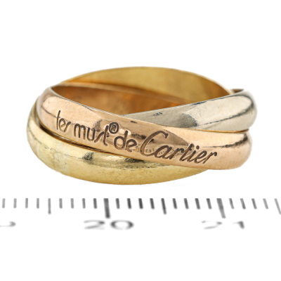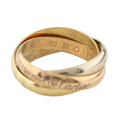 Le Must De Cartier Trinity ring, medium model. 18ct yellow, rose & white gold. Cartier stamped size 51, measures as Australian size: M - ring resizing is not recommended. Individual band width: 3.5mm. Weight: 7.7g. (Pre-owned)