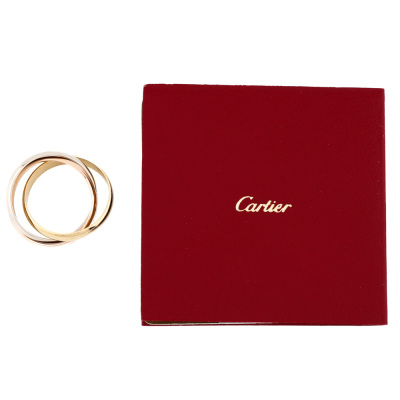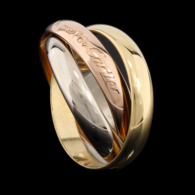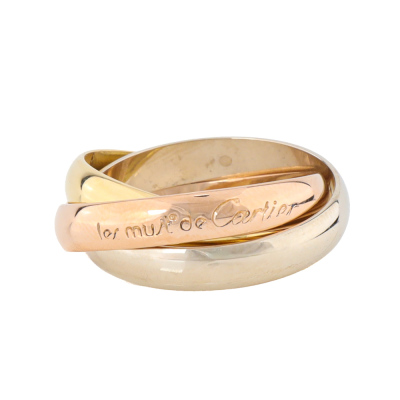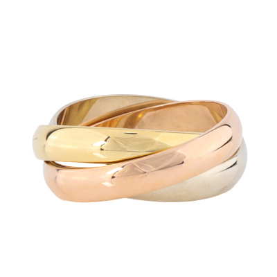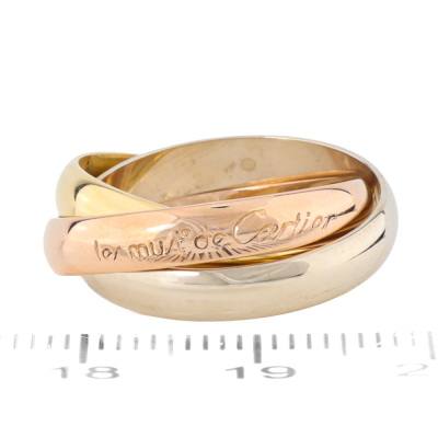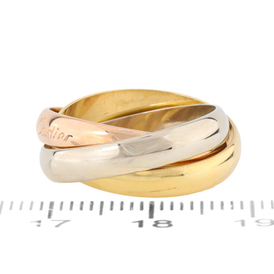 Le Must De Cartier Trinity Ring, medium model. 18ct yellow, rose and white gold. Cartier stamped size 51, measures as Australian size: K - ring resizing is not recommended. Individual band width: 3.5mm. Weight: 7.7g. With Cartier box & Cartier purchase card dated: 21/02/1986. (Pre-owned)
