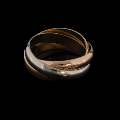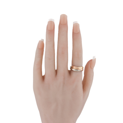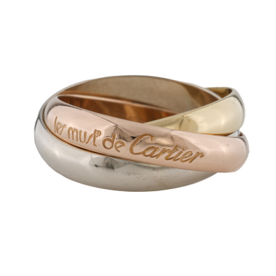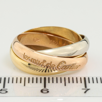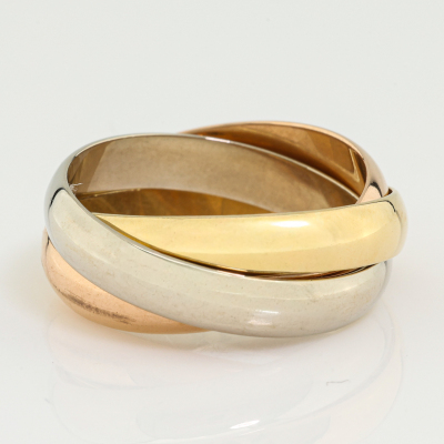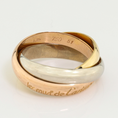 Le Must De Cartier Trinity Ring. 18ct yellow, rose and white gold. Cartier stamped size 51, measures as Australian size: M - ring resizing is not recommended. Individual band width: 3.6mm. Weight: 7.5g.