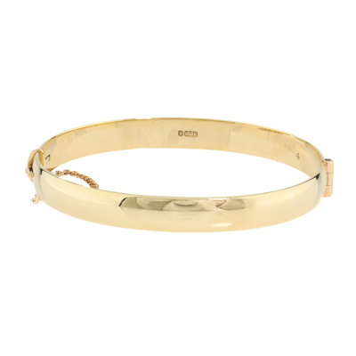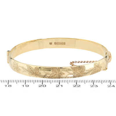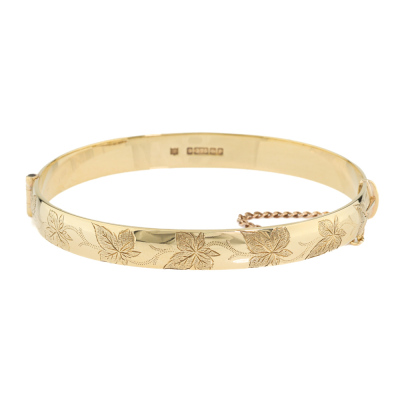 9ct yellow gold leaf pattern bangle. Oval shape with inner circumference: 18cm. With 9ct rose gold safety chain of 5cm. Width: 7.6mm. Weight: 22.4g. (Pre-owned)