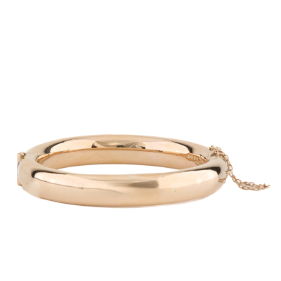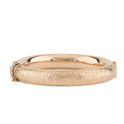 Maple leaf pattern hallow bangle. 9ct rose gold with 9ct rose gold safety chain. Inner circumference: 17.5cm. Width: 1.1cm. Safety chain: 6cm. With personal engraving inside bangle - please refer to images. Weight: 22.6g (Pre-owned)