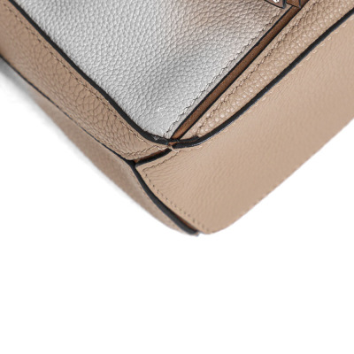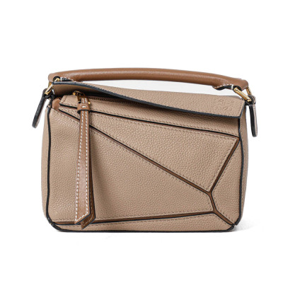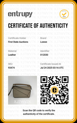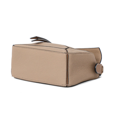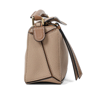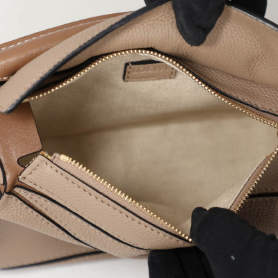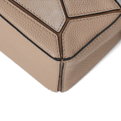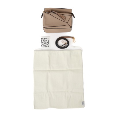 Loewe mini Puzzle Edge bag in Taupe soft grained calfskin. Featuring geometric lines and its cuboid form, gold-tone hardware, single leather handle, and detachable shoulder strap. The top zip closure with calfskin puller opens to beige canvas lining interior. Approximate dimensions: 18cm(L) x 12.5cm(H) x 8cm(D), 4cm handle drop and 55-68cm strap drop, adjustable. Accompanied by a Loewe dustbag. With Entrupy Certificate of Authenticity. (Pre-owned)