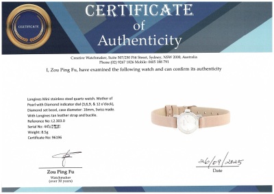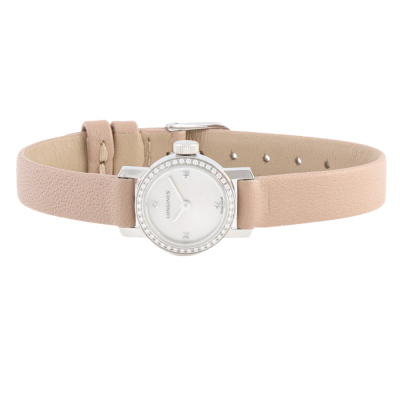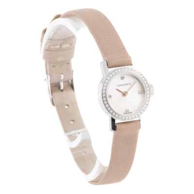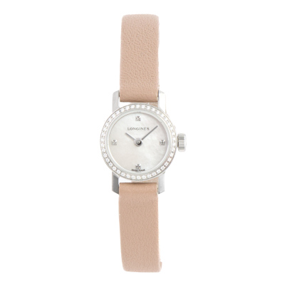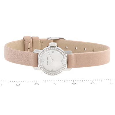 Longines Mini stainless steel quartz ladies watch. Mother of Pearl with Diamond indicator dial (3,6,9, & 12 o'clock), Diamond set bezel, case diameter: 16mm, max wrist size: 16cm, Swiss made. Ref# L2.303.0. With Longines tan leather strap and buckle. With Certificate of Authenticity and Longines box. No warranty applies. Weight: 8.5g (Pre-owned)
