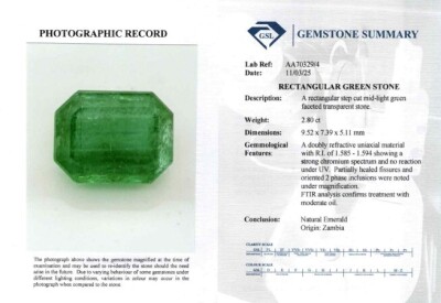 A loose emerald cut Natural Zambian Emerald of 2.80ct (with GSL Report #AA70329/4). (As New)