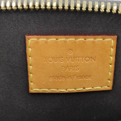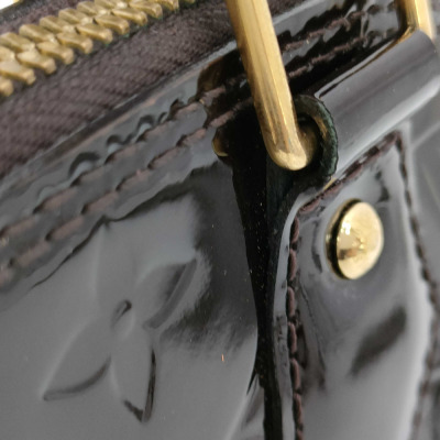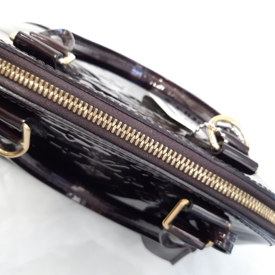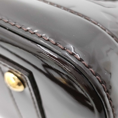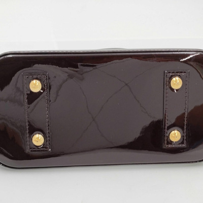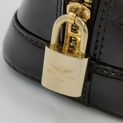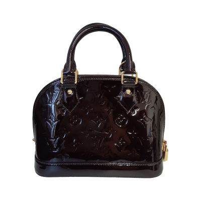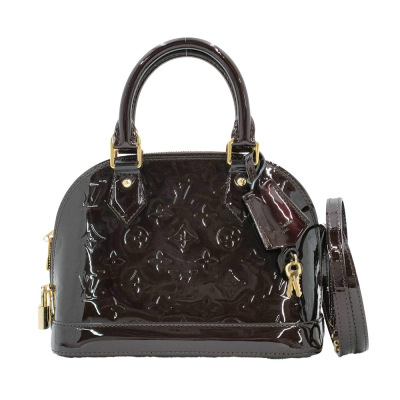 Louis Vuitton Alma BB in Monogram-embossed brown Amarante Vernis leather. Featuring smooth Vernis patent-calf trim, gold-toned hardware, double zip closure. The top opens to a brown textile-lined interior with flat pocket. Approximate dimensions: 24cm (L) x 16.5cm (H) x 11.5cm (D), 9cm handle drop, 56cm detachable strap drop. Accompanied by padlock, key, key bell. With Entrupy Certificate of Authenticity. (Pre-owned)