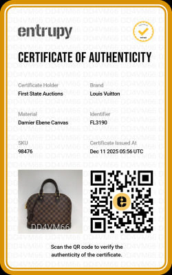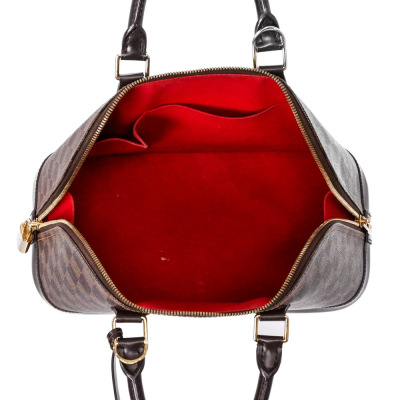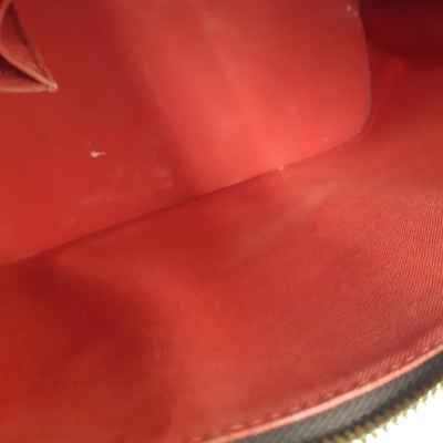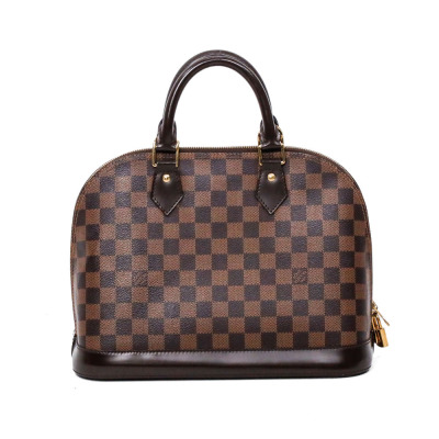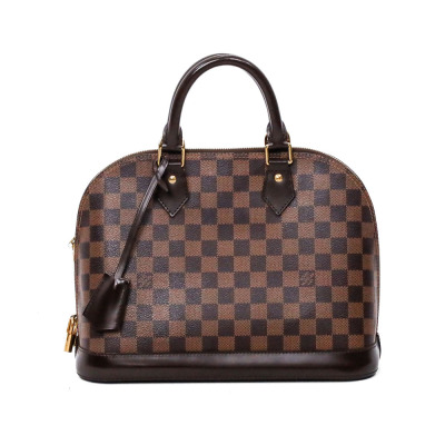 Louis Vuitton Alma PM bag in Damier coated canvas. Featuring a brown cowhide leather trim, gold-toned hardware and dual rolled handles. The double zip closure opens to a red textile-lined interior with flat pockets. Approximate dimensions: 32cm(Base-L) x 24cm(H) x 16cm(D), 10cm handle drop. Accompanied by a detachable brown leather clochette, keys, padlock, Louis Vuitton receipt, dustbag and box. With Entrupy certificate of authenticity. (Pre-owned)