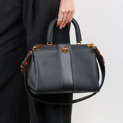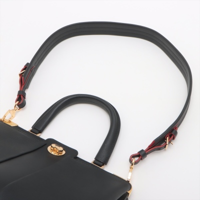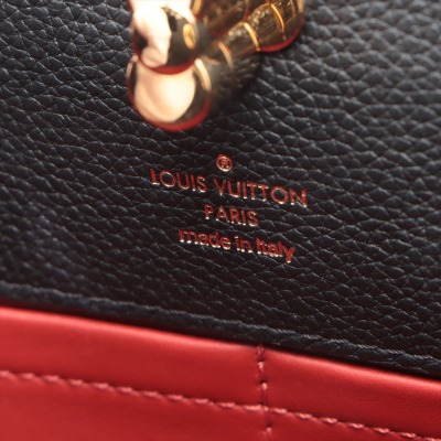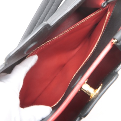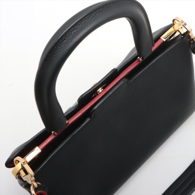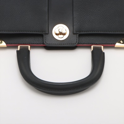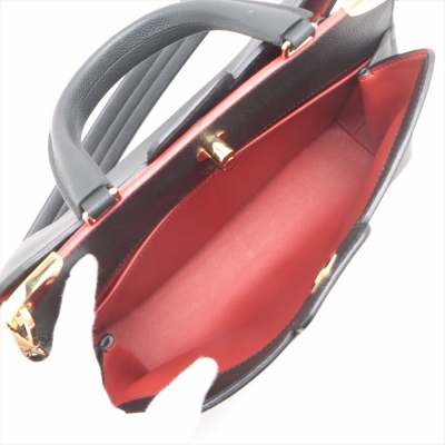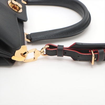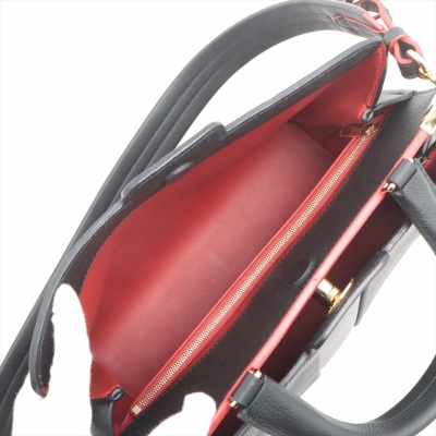 Louis Vuitton Astrid Handbag in black grained calfskin leather. Featuring gold-toned hardware, single leather handle, and black strip with LV monogram flower detail. The top opens to two red leather lined compartments with a zip pocket, separated by a centre divider. Approximate dimensions: 31cm(L) x 21cm(H) x 14cm(D), handle drop 11cm, adjustable and detachable shoulder strap 39cm. Accompanied by LV dustbag. With Entrupy Certificate of Authenticity. (Pre-owned)
