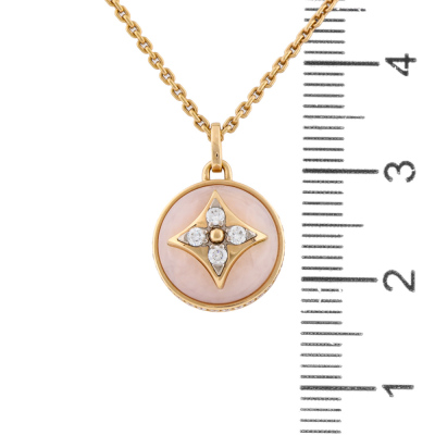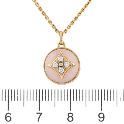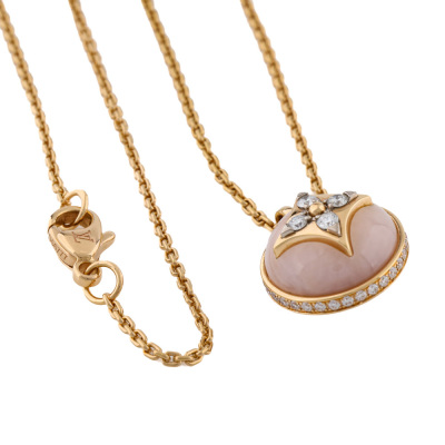 Louis Vuitton B Blossom necklace with Pink Opal and round Natural Diamonds totalling 0.10ct. Motif size: 11.5mm. 18ct rose gold with 41cm 18ct rose gold Louis Vuitton chain. Made in France With Louis Vuitton box. With certificate #9685182097379994
