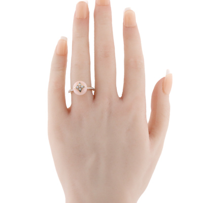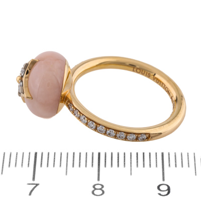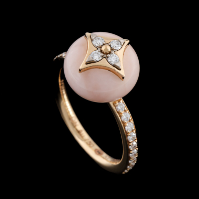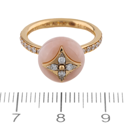 Louis Vuitton B Blossom ring with Monogram Flower motif, Natural Pink Opal and 24 round Natural Diamonds totalling approximately 0.20ct. Motif (ball) size 10.9mm. 18ct rose gold. Stamped size 51. Band Width: 2.3mm With Louis Vuitton Box. With certificate #0323157362645354