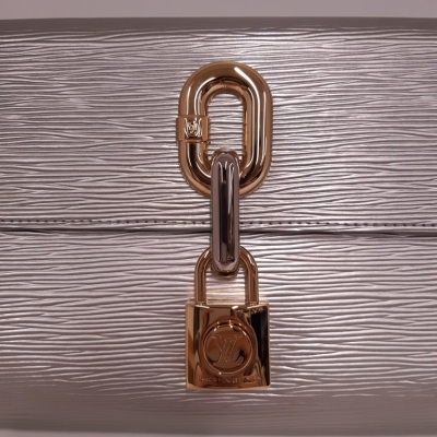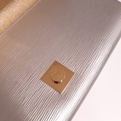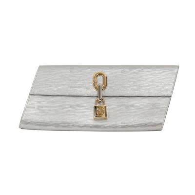 Louis Vuitton Blade clutch in metallic silver Epi leather. Featuring silver & gold hardware, parallelogram body shape, magnetic closure with padlock design on frontal flap. This opens to a metallic gold leather interior with zipper and patch pockets. Approximate dimensions: 36cm(L) x 17cm(H) x 3cm(D). Accompanied by a metal mirror and a LV dust bag. With copy of purchase invoice from LV Boutique. (Pre-owned)