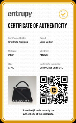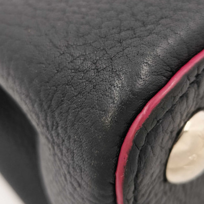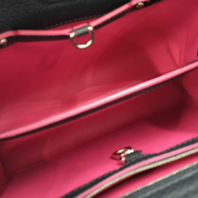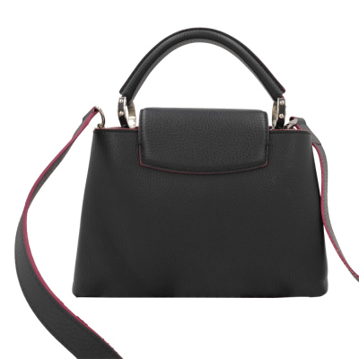 Louis Vuitton Capucines BB in navy blue full grain Taurillon leather with pink leather trims (year 2016). Featuring silver-toned hardware, leather-wrapped LV initials at front, single rolled leather handle. The flap & hook closures open to a pink leather interior with two compartments & a zip pocket. Approximate dimensions: 28cm(Base-L) x 19cm(H) x 10cm(D), handle drop 5cm, detachable & adjustable shoulder strap drop 57cm. With Entrupy Certificate of Authenticity. (Pre-owned)