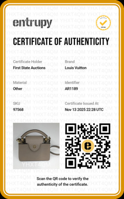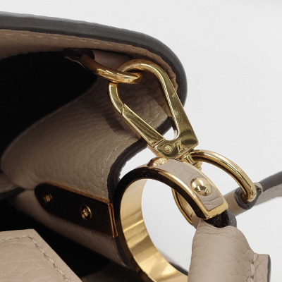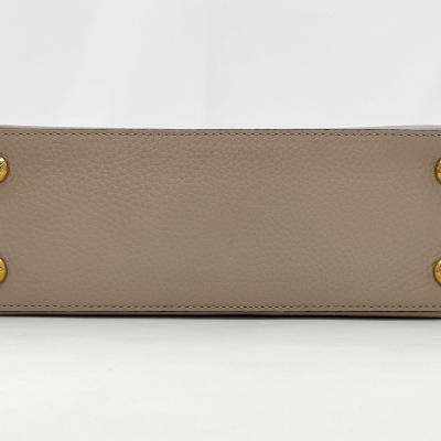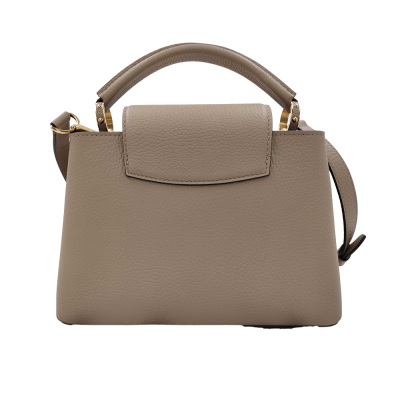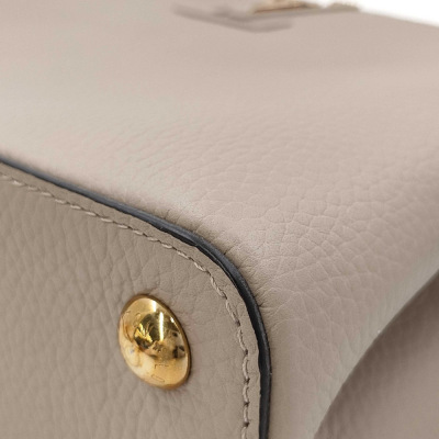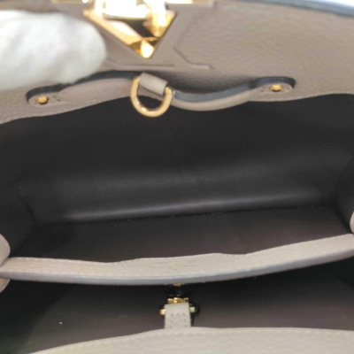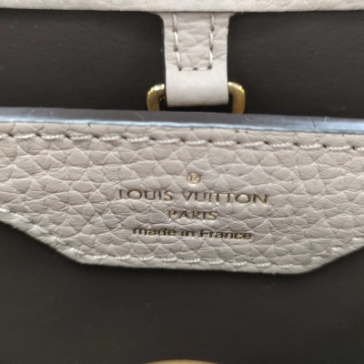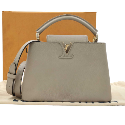 Louis Vuitton Capucines BB in Galet full grain Taurillon leather. Featuring gold-toned hardware, leather-wrapped LV initials, single rolled leather handle. The flap & hook closure open to a dark brown leather interior with two compartments and a zip pocket. Approx. dimensions: 28cm(Base-L) x 19cm(H) x 10cm(D), handle drop 5cm, detachable and adjustable shoulder strap drop 57cm. Accompanied by LV dustbag & box. With Entrupy Certificate of Authenticity. (Pre-owned)