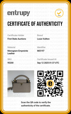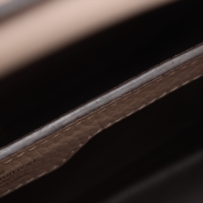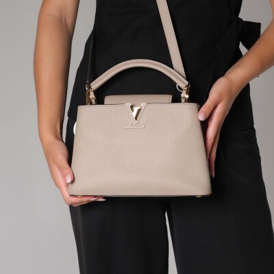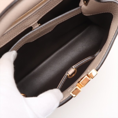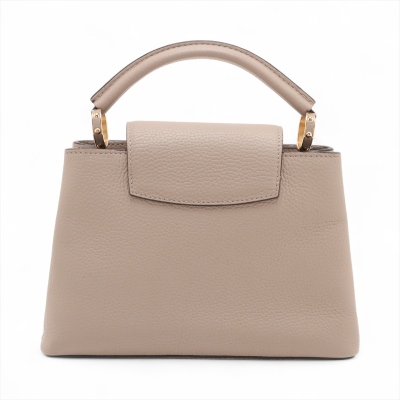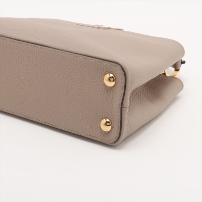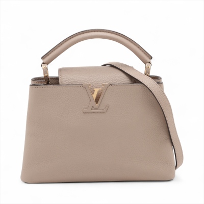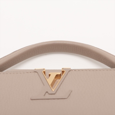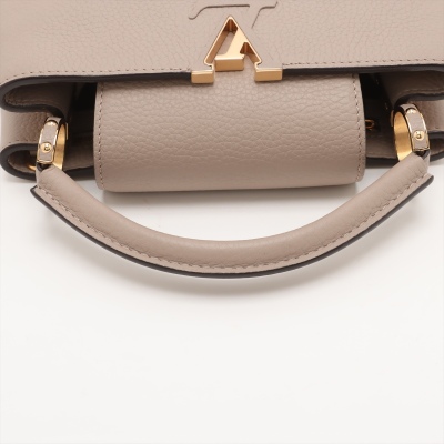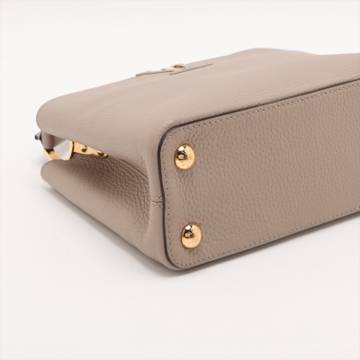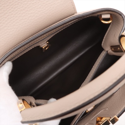 Louis Vuitton Capucines BB in Galet full grain Taurillon leather. Featuring gold-toned hardware, leather-wrapped LV initials, single rolled leather handle. The flap & hook closure open to a dark brown leather interior with two compartments and a zip pocket. Approx. dimensions: 28cm(Base-L) x 19cm(H) x 10cm(D), handle drop 5cm, detachable and adjustable shoulder strap drop 57cm. Accompanied by LV dustbag & box. With Entrupy Certificate of Authenticity. (Pre-owned)