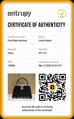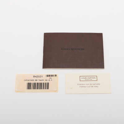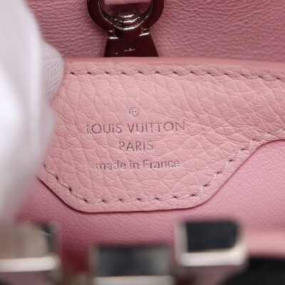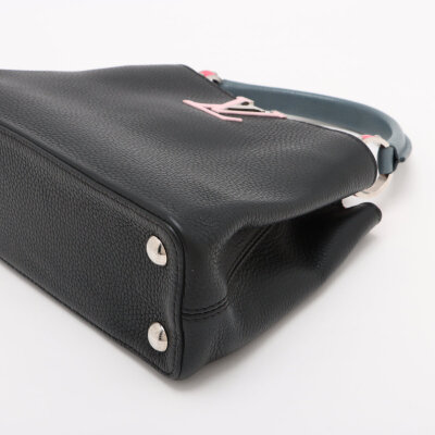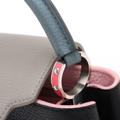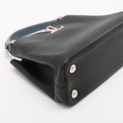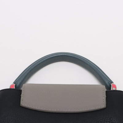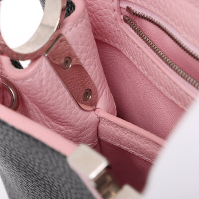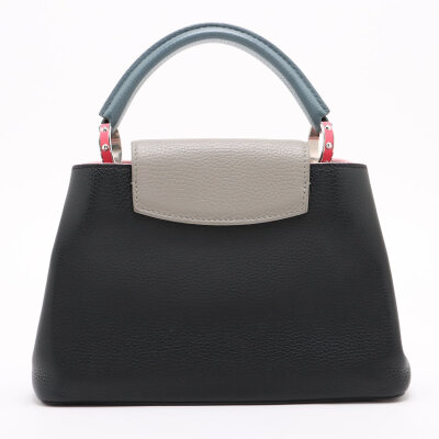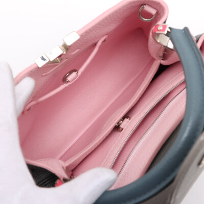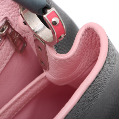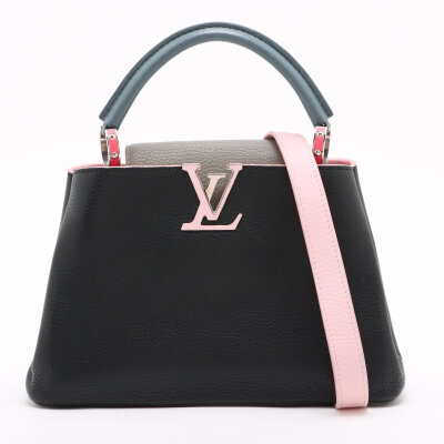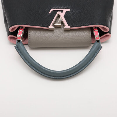 Louis Vuitton Capucines BB in black, grey and pink Taurillon leather (circa: 2016). Featuring silver-toned hardware, leather-wrapped LV initials, single blue-grey leather handle and a detachable pink leather strap. The flap and hook closure open to a pink leather interior with two compartments and a zipper pocket. Approximate dimensions: 26cm(Base-W) x 18cm(H) x 9cm(D), with a 7cm handle drop and 51cm strap drop. With Entrupy Certificate of Authenticity.