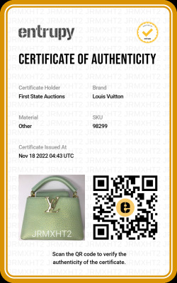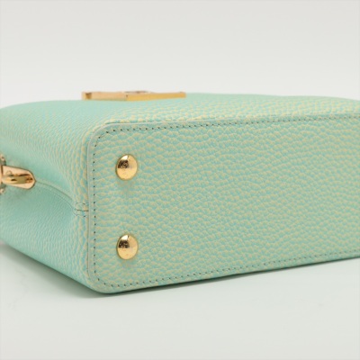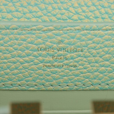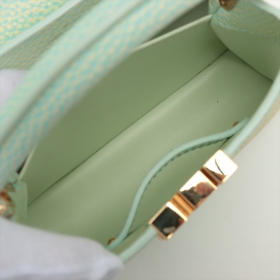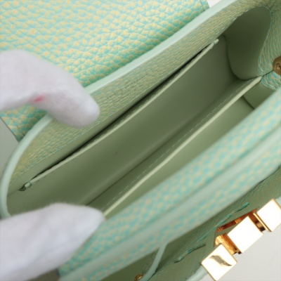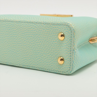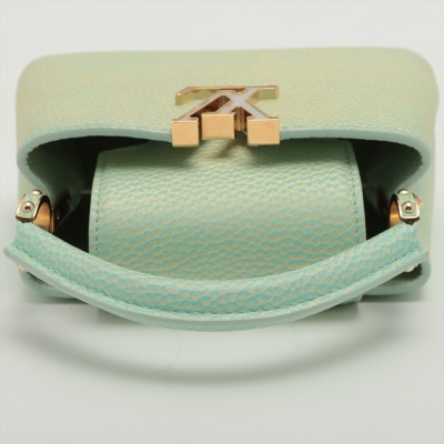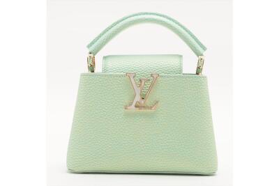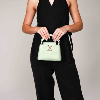 Louis Vuitton Capucines Mini in Vert d'eau Green Taurillon leather. Featuring gold-tone hardware, seashell-effect LV initials at front, and single colour matching leather handle. The top flap closure opens to a light green leather interior with two compartments with patched pockets. Approximate dimensions: 20cm(B-L) x 13cm(H) x 7.5cm(D), handle drop 7cm, adjustable and detachable strap 58cm. Accompanied by LV info booklet. With Entrupy Certificate of Authenticity. (Pre-owned)