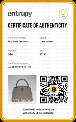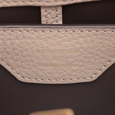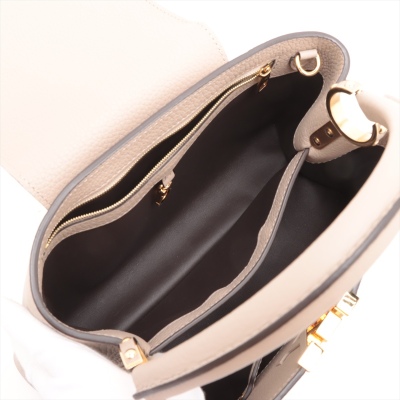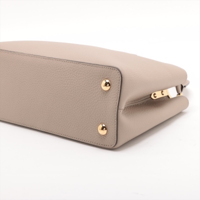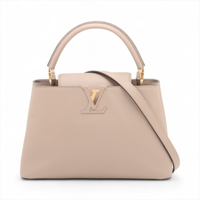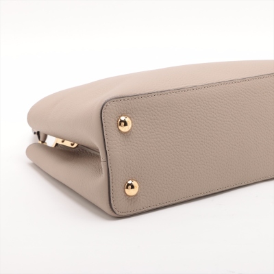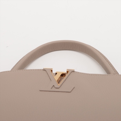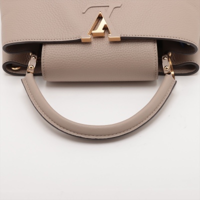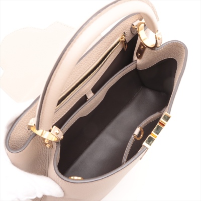 Louis Vuitton Capucines MM in Galet full grain Taurillon leather. Featuring gold-toned hardware, leather-wrapped LV initials, and single rolled leather handle. The flap and hook closure open to a dark brown leather interior with two compartments and a zipper pocket. Approximate dimensions: 31cm(Base-L) x 21cm(H) x 11cm(D), handle drop 10cm, adjustable and detachable strap 57cm. Accompanied by a LV dustbag. With Entrupy Certificate of Authenticity. (Pre-owned)