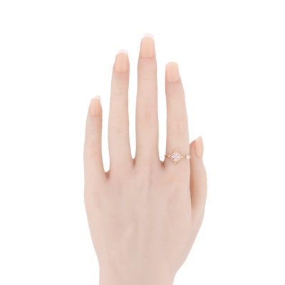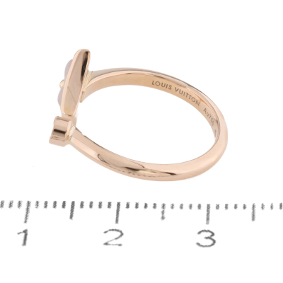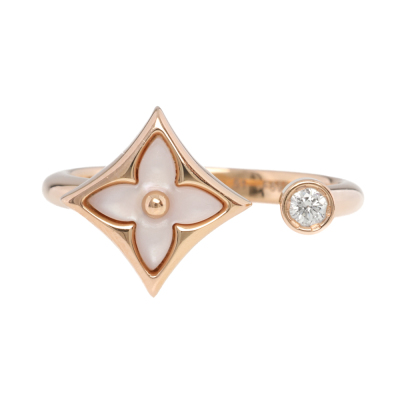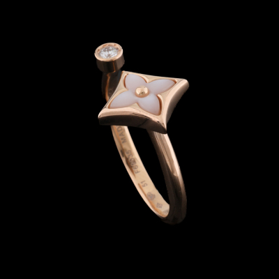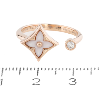 Louis Vuitton Colour Blossom Mini Star ring with pink Mother of Pearl inlay and a round Natural Diamond of 0.04ct. 18ct rose gold. Louis Vuitton stamped size 51 - measures as Australian size: K, ring resizing is not recommended. Band width: 2mm. Motif size: 11.0mm. Made in France. Weight: 3.2g. With Louis Vuitton box.