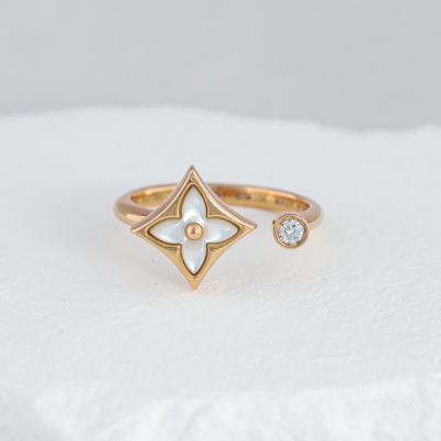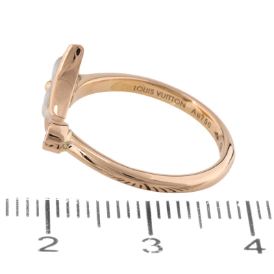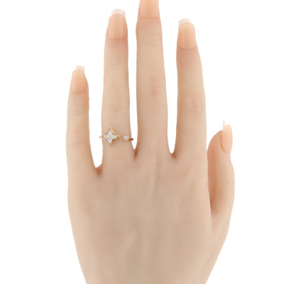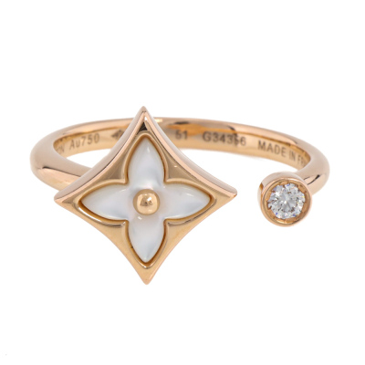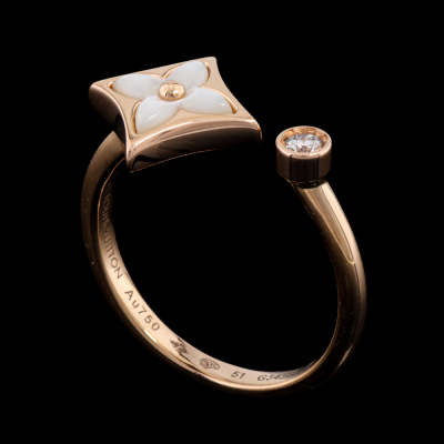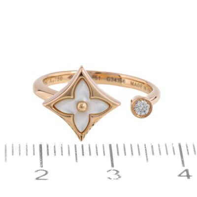 Louis Vuitton Colour Blossom Mini Star ring with Mother of Pearl inlay and a round Natural Diamond of 0.04ct. 18ct rose gold. Louis Vuitton stamped size 51, measures as Australian size: K. Band width: 2mm. Made in France. Weight: 3.1g. With Louis Vuitton box. (Pre-owned)