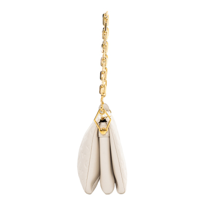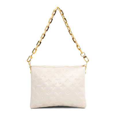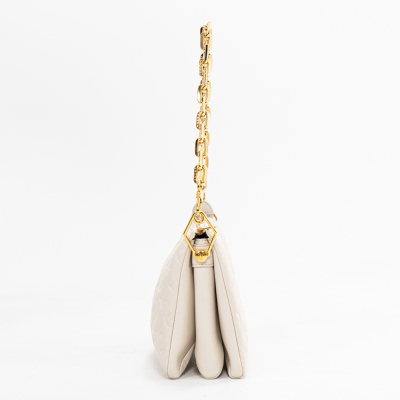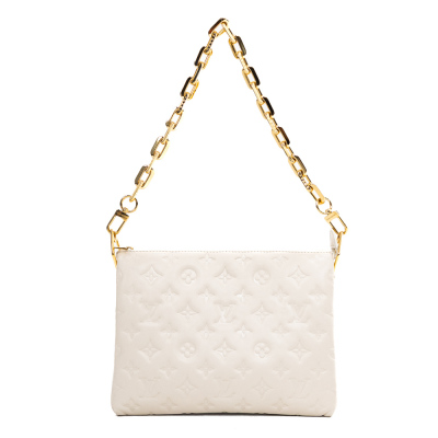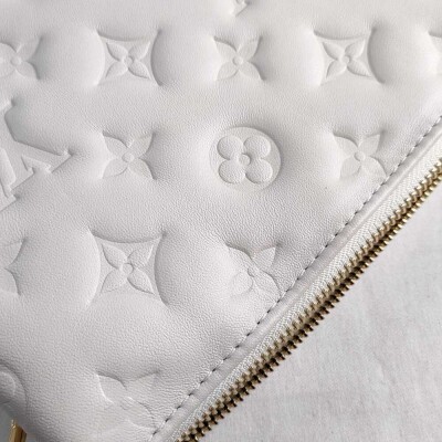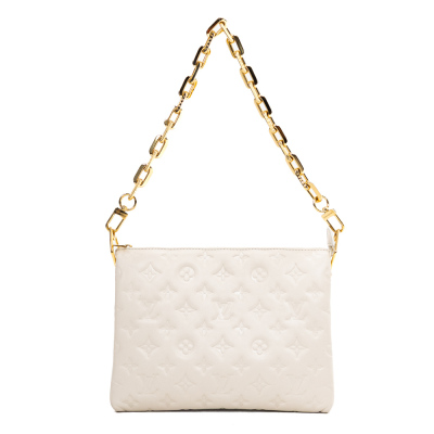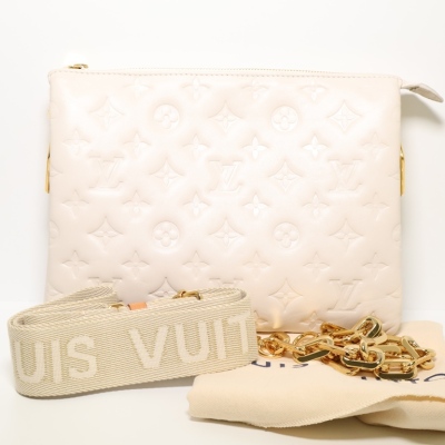 Louis Vuitton Coussin PM in Crème Monogram embossed puffy lambskin (circa: after 2021). Featuring gold-toned hardware, a detachable wide canvas strap, and a detachable chain strap secured by angular links. The top zip opens to a khaki leather interior with 2 compartments divided by a central zipped pocket. Approx. dimensions: 26.5cm(L) x 19cm(H) x 8.5cm(D), with a 24cm chain strap drop and 45cm adjustable wide canvas strap drop. Accompanied by a Louis Vuitton dustbag. With Entrupy Certificate of Authenticity.