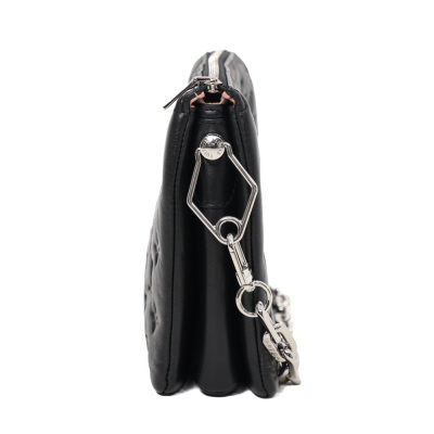 Louis Vuitton Coussin PM in black Monogram embossed puffy lambskin (circa: after 2021). Featuring silver-toned hardware, a detachable canvas web strap, and a detachable chain handle secured by angular links. The top zip opens to a pink leather interior with two compartments divided by a central zippered pocket. Approximate dimensions: 26.5cm(W) x 19cm(H) x 8.5cm(D), with a 24cm handle drop and 53cm adjustable web canvas strap drop. With Entrupy Certificate of Authenticity.