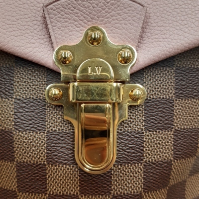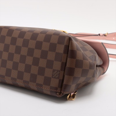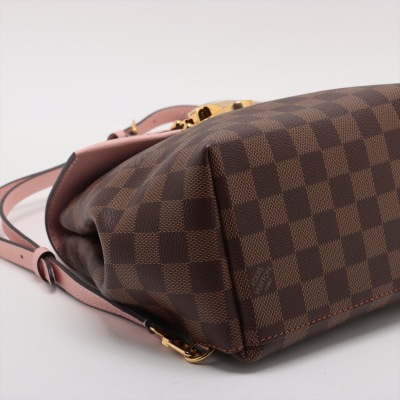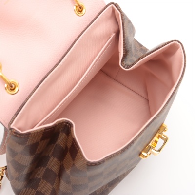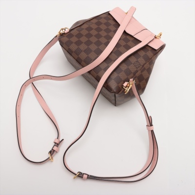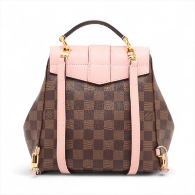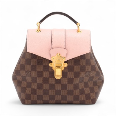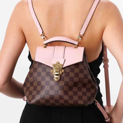 Louis Vuitton Clapton backpack in Damier Ebene checked coated canvas with pink grained leather front flap and strap. Featuring gold-toned hardware, single flat handle, magnetic buttons on sides. Push lock on front flap opens to a pink fabric lining interior with a patch pocket. Approximate dimensions: 20cm(L) x 23cm(H) x 11cm(D), 4.5cm handle drop and 47cm shoulder strap hight, detachable and adjustable. With Entrupy Certificate of Authenticity. (Pre-owned)
