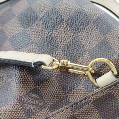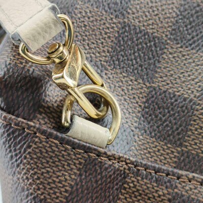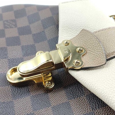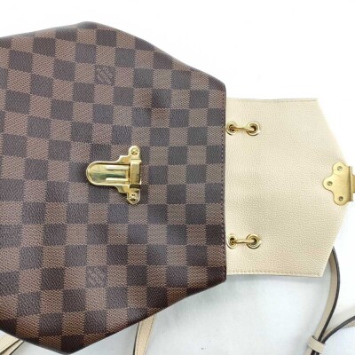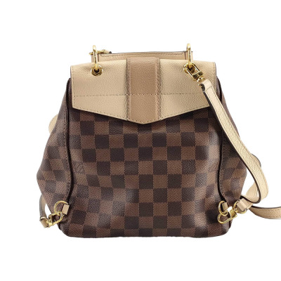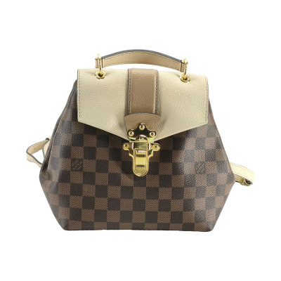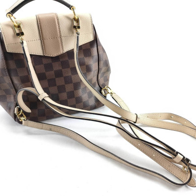 Louis Vuitton Clapton backpack in Damier Ebene checked coated canvas with light brown & beige grained leather front flap and strap (Circa: 2019). Featuring gold-toned hardware, single flat top handle, and magnetic snap buttons on sides. The push-lock on the front flap opens to a light brown textile-lined interior with a patch pocket. Approximate dimensions: 20cm(L) x 23cm(H) x 11cm(D), 47cm shoulder strap height, detachable and adjustable. Accompanied by a LV information book. With Entrupy Certificate of Authenticity.