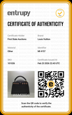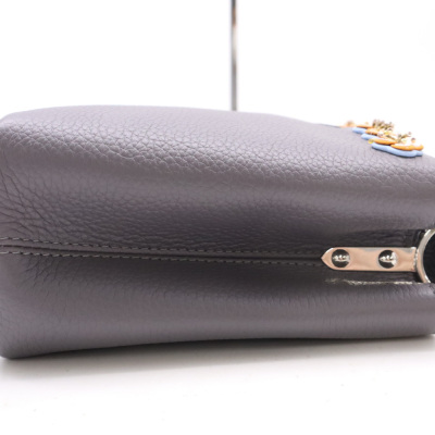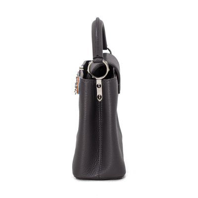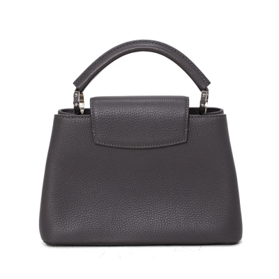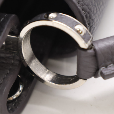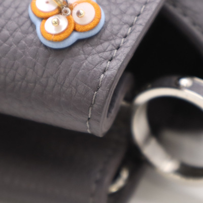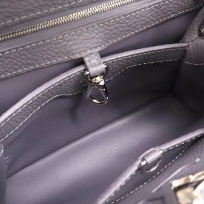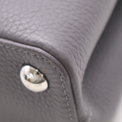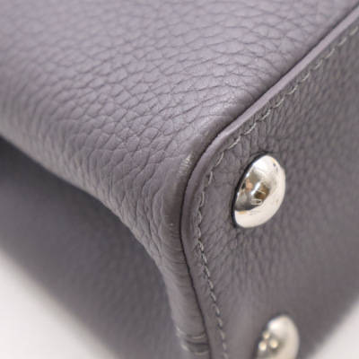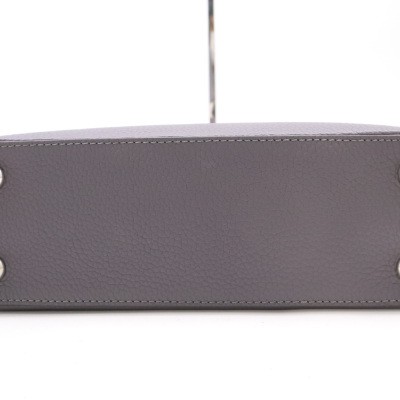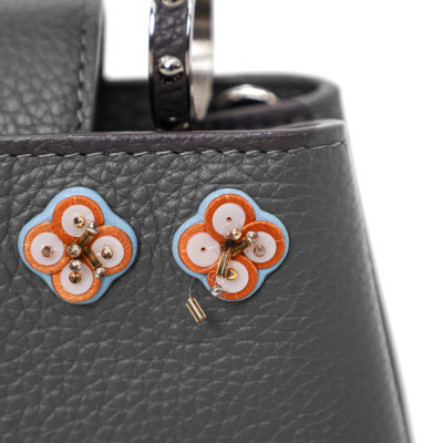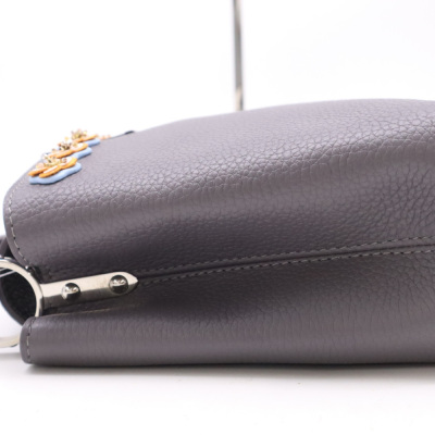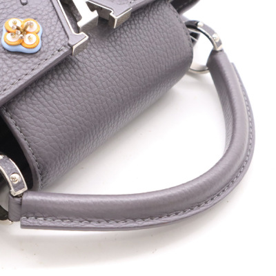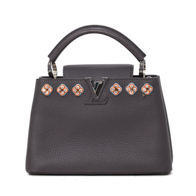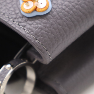 Louis Vuitton Capucines BB in grey grained Taurillon leather with blue, orange, white and gold flora embellishments (circa 2017). Featuring silver-toned hardware, leather-wrapped LV initials at front, single rolled leather handle and a detachable leather strap. The flap & hook closures open to a grey leather interior with two compartments and a zippered pocket. Approximate dimensions: 28cm(base-W) x 19cm(H) x 10cm(D), with a 5cm handle drop and 52cm adjustable strap drop. Accompanied by a Louis Vuitton dustbag. With Entrupy Certificate of Authenticity.