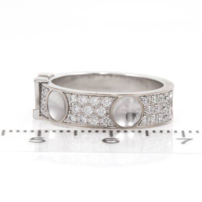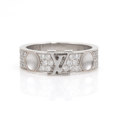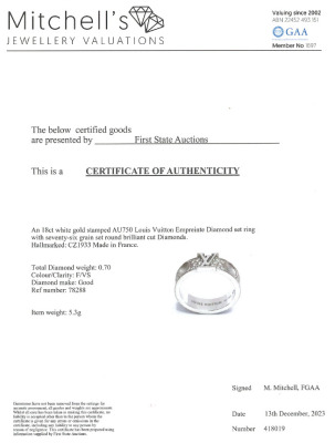 Louis Vuitton Empreinte Diamond ring with round Natural Diamonds totalling 0.70ct (Estimated grading: F VS). 18ct white gold. Stamped size 50, J1/2 - ring resizing is not recommended. Band width: 5.0mm. Made in France. Weight: 5.3g. With Certificate #418019. (Pre-owned)