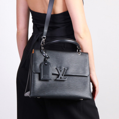 Louis Vuitton Grenelle MM in black Epi leather. Featuring silver-toned hardware, looping leather top handle with silver ring links, and flap with LV logo and magnetic closure. This opens to an orange suede interior with zip and patch pockets. Approx. dimensions: 30cm(B-L) x 24cm(H) x 14cm(D), handle drop 10cm, detachable shoulder strap drop 42cm. Accompanied by name tag clochette, LV dustbag, and box. With Entrupy Certificate of Authenticity. (Pre-owned)