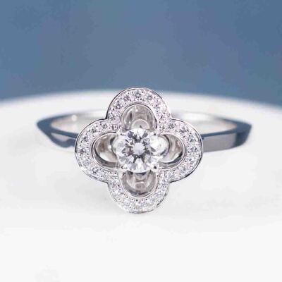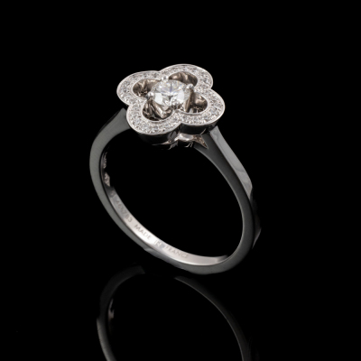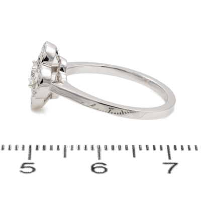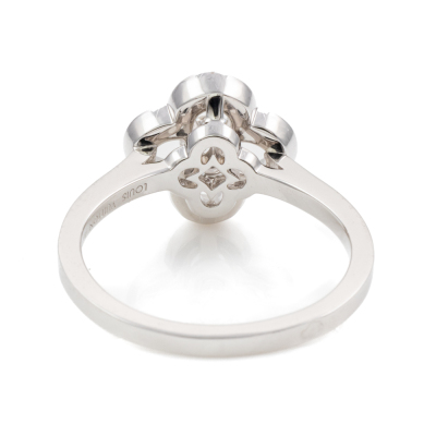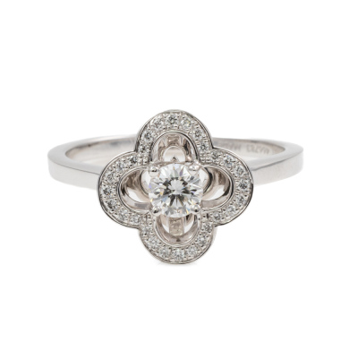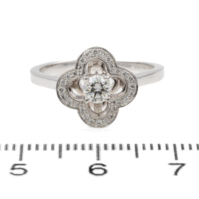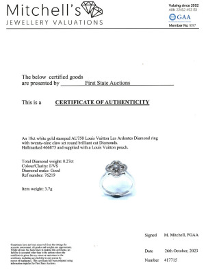 Louis Vuitton Les Ardentes Diamond ring with centre round Natural Diamonds of 0.20ct and 28 round Natural Diamonds totalling 0.07ct. Motif size: 11mm. 18ct white gold. Stamped size 51, measures as Australian size: K 1/2 - ring resizing is not recommended. - ring resizing is not recommended. Band width: 1.5mm. Weight: 3.7g. Made in France. With Louis Vuitton pouch. With Certificate #417715. (Pre-owned)