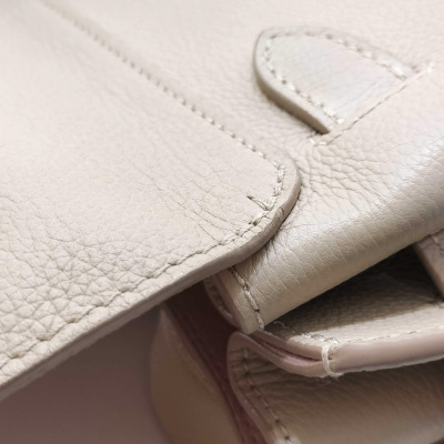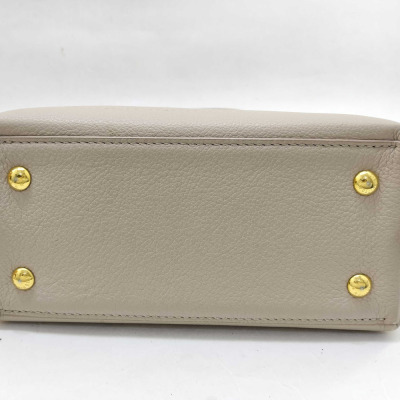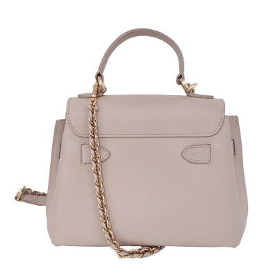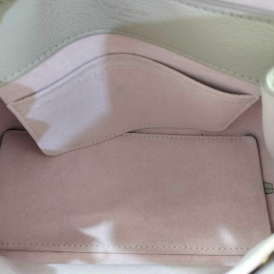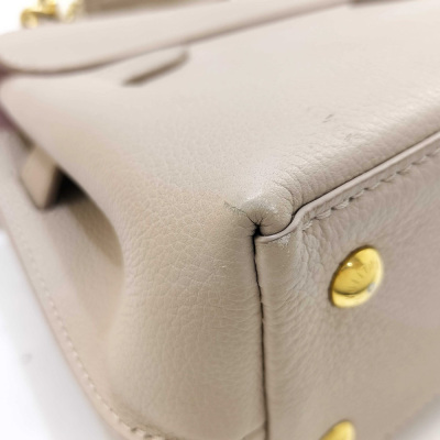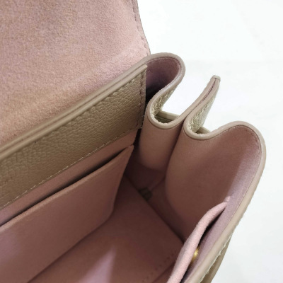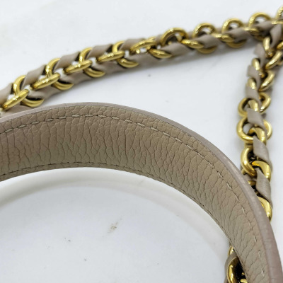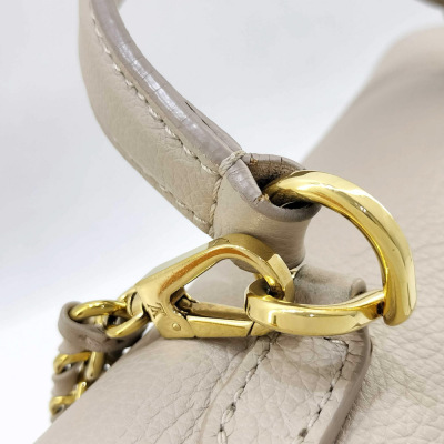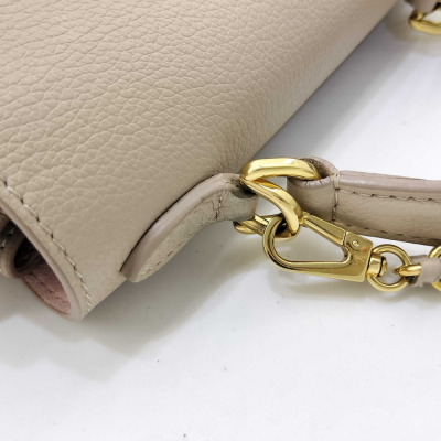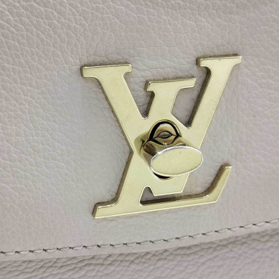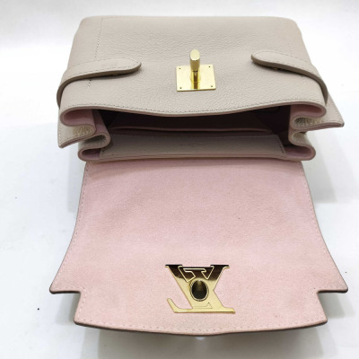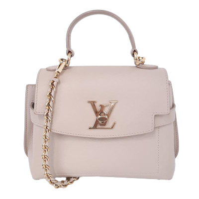 Louis Vuitton LockMe Ever mini bag in beige calfskin leather (RFID confirmed). Featuring gold-toned hardware, single top flat leather handle, detachable leather-chain shoulder strap, and snap button accordion sides. The foldover flap with LV turn lock opens to a pink microfiber lining interior with two interior patch pockets. Approximate dimensions: 21cm (base-L) x 16cm (H) x 9cm (base-D), handle drop 8.5cm, 54cm strap drop. Accompanied by a Louis Vuitton dustbag and box. With Entrupy Certificate of Authenticity. (Pre-owned)