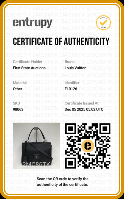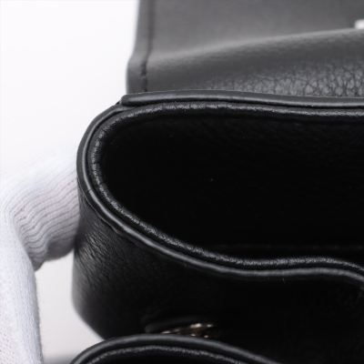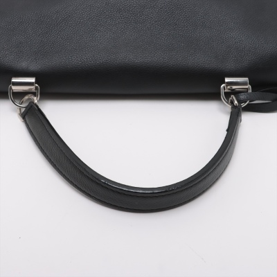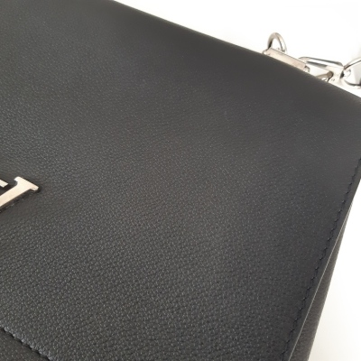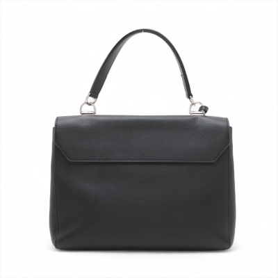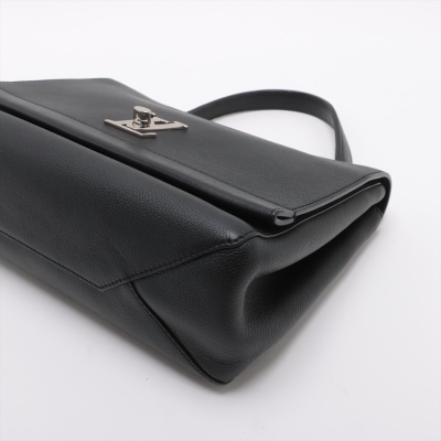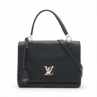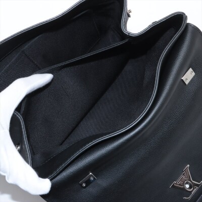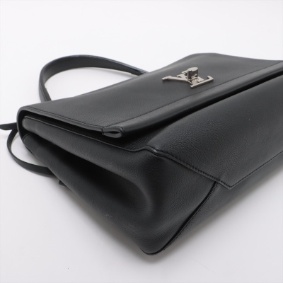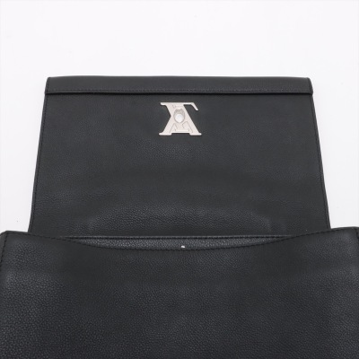 Louis Vuitton LockMe II 2way bag in black calfskin leather. Featuring silver-tone hardware, flat leather top handle, snap buttons on sides, full flip-over flap with LV logo. The turn-lock closure opens to a black textile-lined interior with 2 compartments divided by centre flat pocket. Approx dimensions: 27.5cm(L) x 19.5cm(H) x 9.5cm(D), 9cm detachable handle height & 54cm detachable & adjustable strap drop. With Entrupy Certificate of Authenticity.(Pre-owned)