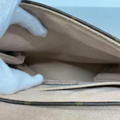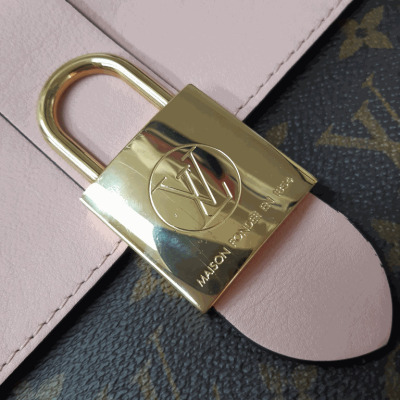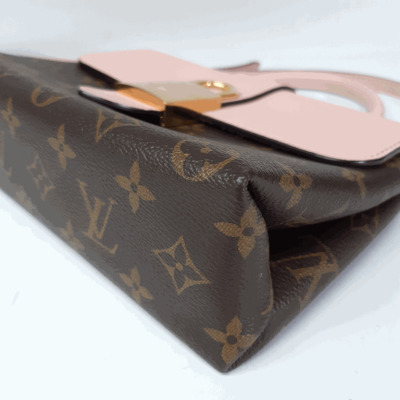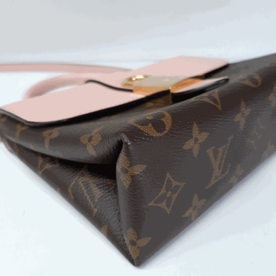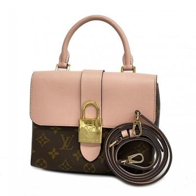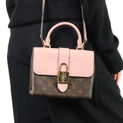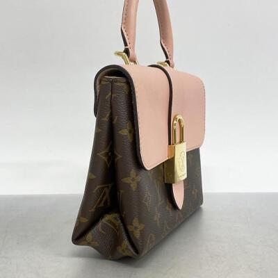 Louis Vuitton Locky BB in Monogram coated canvas and light pink cowhide leather. Featuring gold-toned hardware, single rolled top handle, adjustable & detachable leather shoulder strap, and front flap with decorative padlock button closure. This opens to a light pink microfibre interior with a patch pocket. Approximate dimensions: 21cm(L) x 16cm(H) x 8cm(D), handle drop 8cm, strap drop 59cm. With Entrupy Certificate of Authenticity. (Pre-owned)