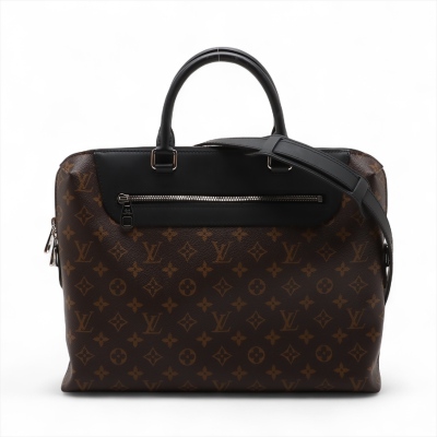 Louis Vuitton Macassar Porte-Documents Jour NM in Monogram coated canvas and black smooth leather. Featuring silver-toned hardware, dual rolled handles, a zippered pocket at front. The top zipper opens to a purple textile lining interior with multi-patched pockets. Approx dimensions: 38cm(W) x 29cm(H) x 7cm(D), 10.5cm handle drop. 53cm shoulder drop, adjustable & detachable. Accompanied by LV dust bag & box. With Entrupy Certificate of Authenticity. (Pre-owned)