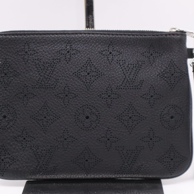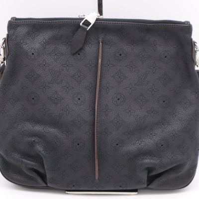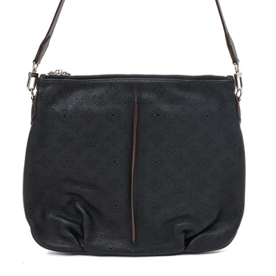 Louis Vuitton Mahina Selene PM in noir Mahina leather with brown leather trims. Featuring silver-toned hardware, a detachable leather strap and double zippers on top. This opens to a brown microfibre lined interior with a zippered and patched pockets. Approximate dimensions: 36cm(Base-W) x 29cm(H) x 5cm(D), with a 43cm adjustable strap drop. Accompanied by a detachable zipper pouch. Note: removable handle, leather clochette, keys and padlock NOT included. With Entrupy Certificate of Authenticity.
