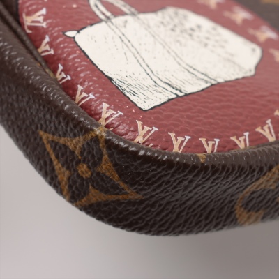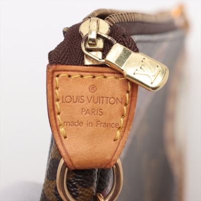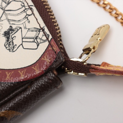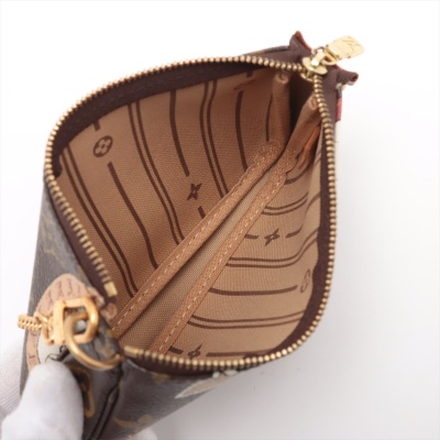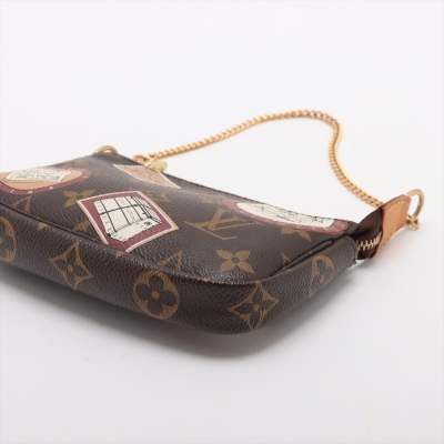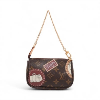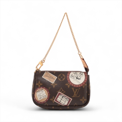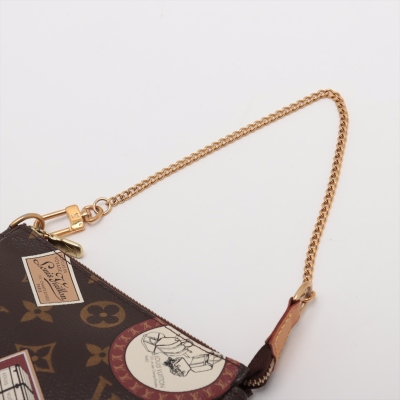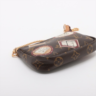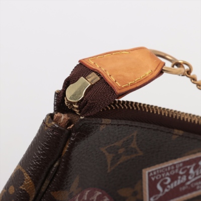 Louis Vuitton mini pochette accessories in Monogram coated canvas with Voyage patches. Featuring gold-toned hardware, convertible vachetta leather carry strap to wrist strap. The zipper closure opens to a light brown textile interior. Approximate dimensions: 15.5cm(L) x 10cm(H) x 3cm(D), strap drop 15cm. With Entrupy Certificate of Authenticity. (Pre-owned)